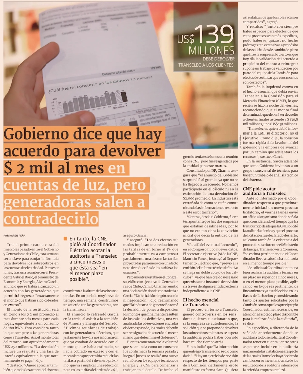 El Ejecutivo plantea primeros montos de devolución por errores en cuentas de la luz - (El Mercurio de Santiago)