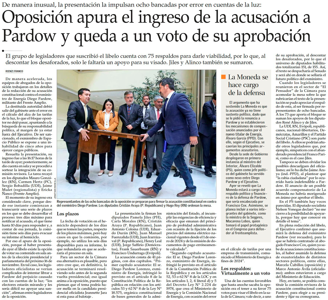 Oposición presenta acusación contra exministro Pardow y se abre debate por rol de La Moneda en su defensa - (La Tercera)
