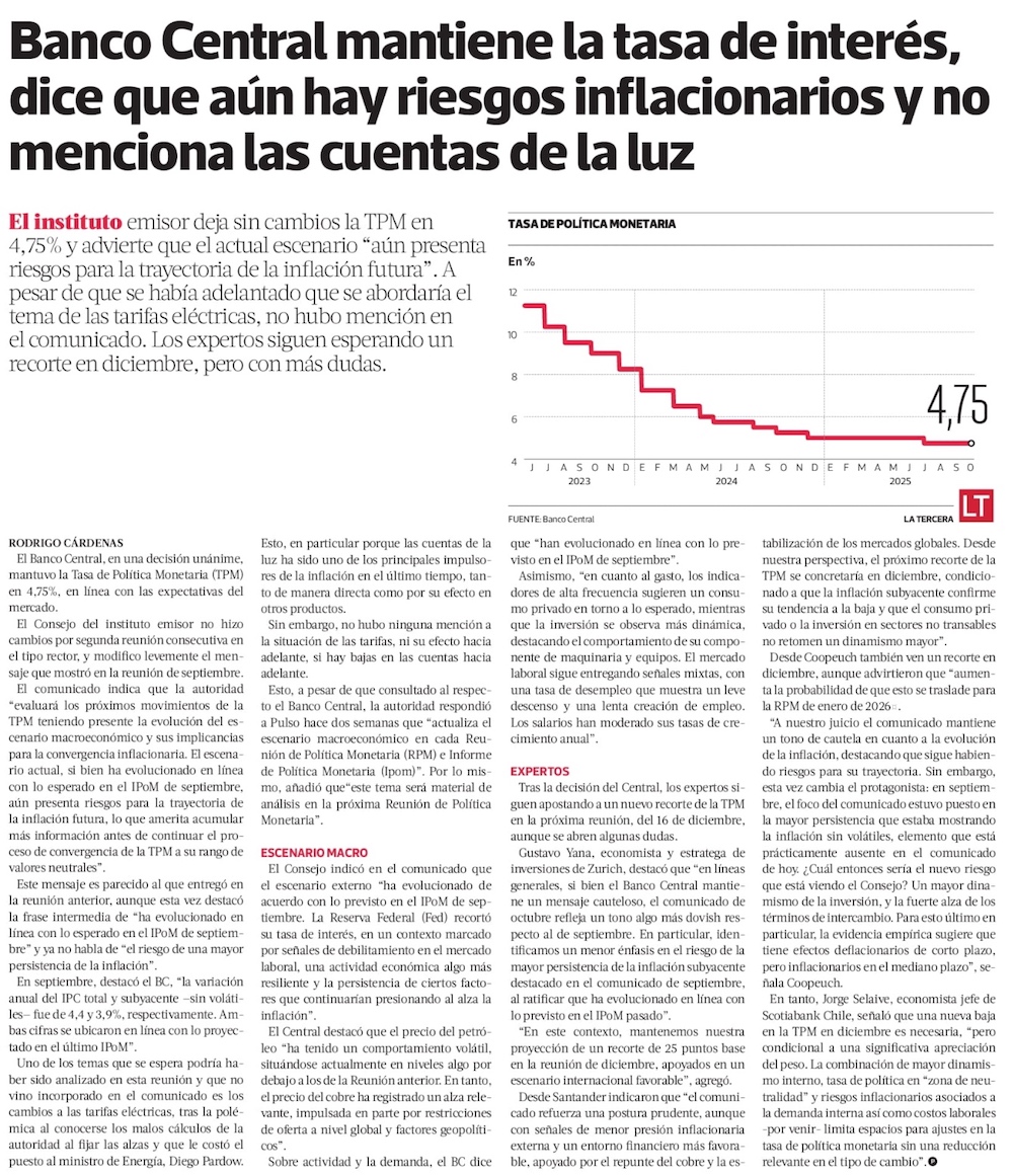 BC mantiene tasa y ve “esencial” que autoridades definan tema tarifario para ver efecto en inflación 2026 - (Diario Financiero)