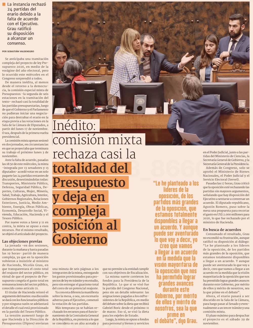 Duro revés para Grau: parlamentarios rechazan casi todos los gastos y tensionan el debate presupuestario - (El Mercurio de Santiago)