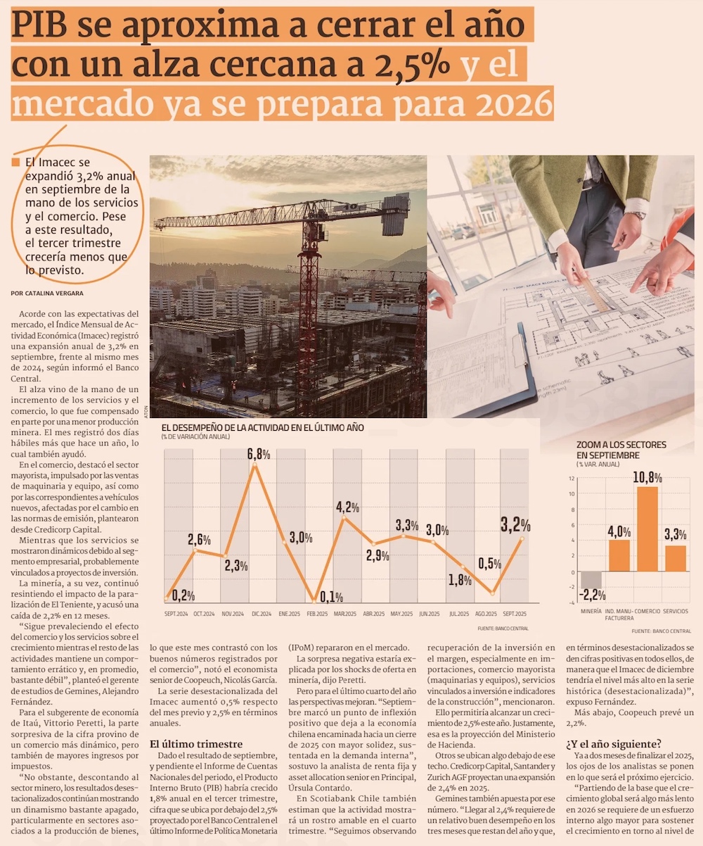 Imacec sube 3,2% en septiembre, pero economía cierra su trimestre más bajo en más de un año - (Pulso)