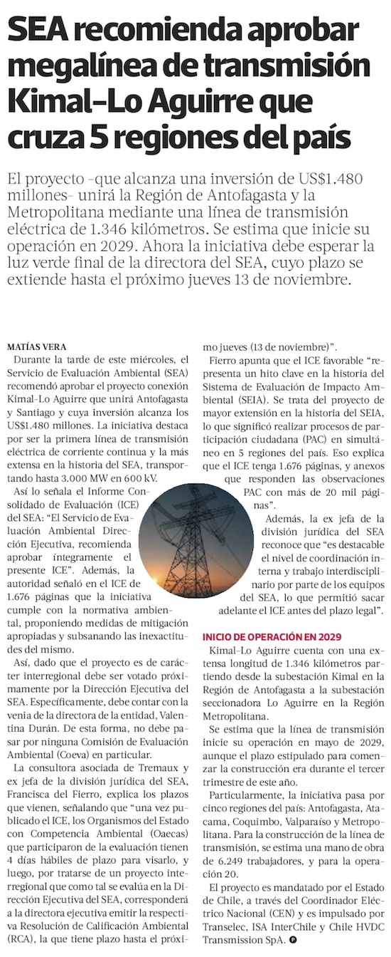 SEA recomienda aprobar megalínea de transmisión Kimal-Lo Aguirre que cruza 5 regiones del país - (La Tercera Online)