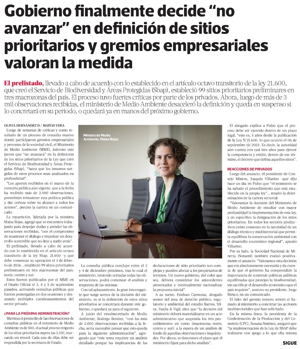 Medio Ambiente opta por pausar definición de 99 sitios prioritarios ante presión del sector privado - (Diario Financiero)