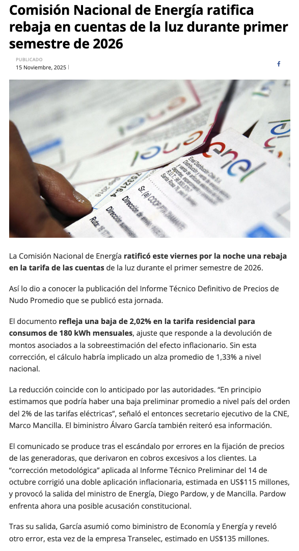 CNE ratifica reducción de las tarifas de la luz a partir de 2026: se concretará una baja promedio nacional de 2,02% - (puranoticia.cl)