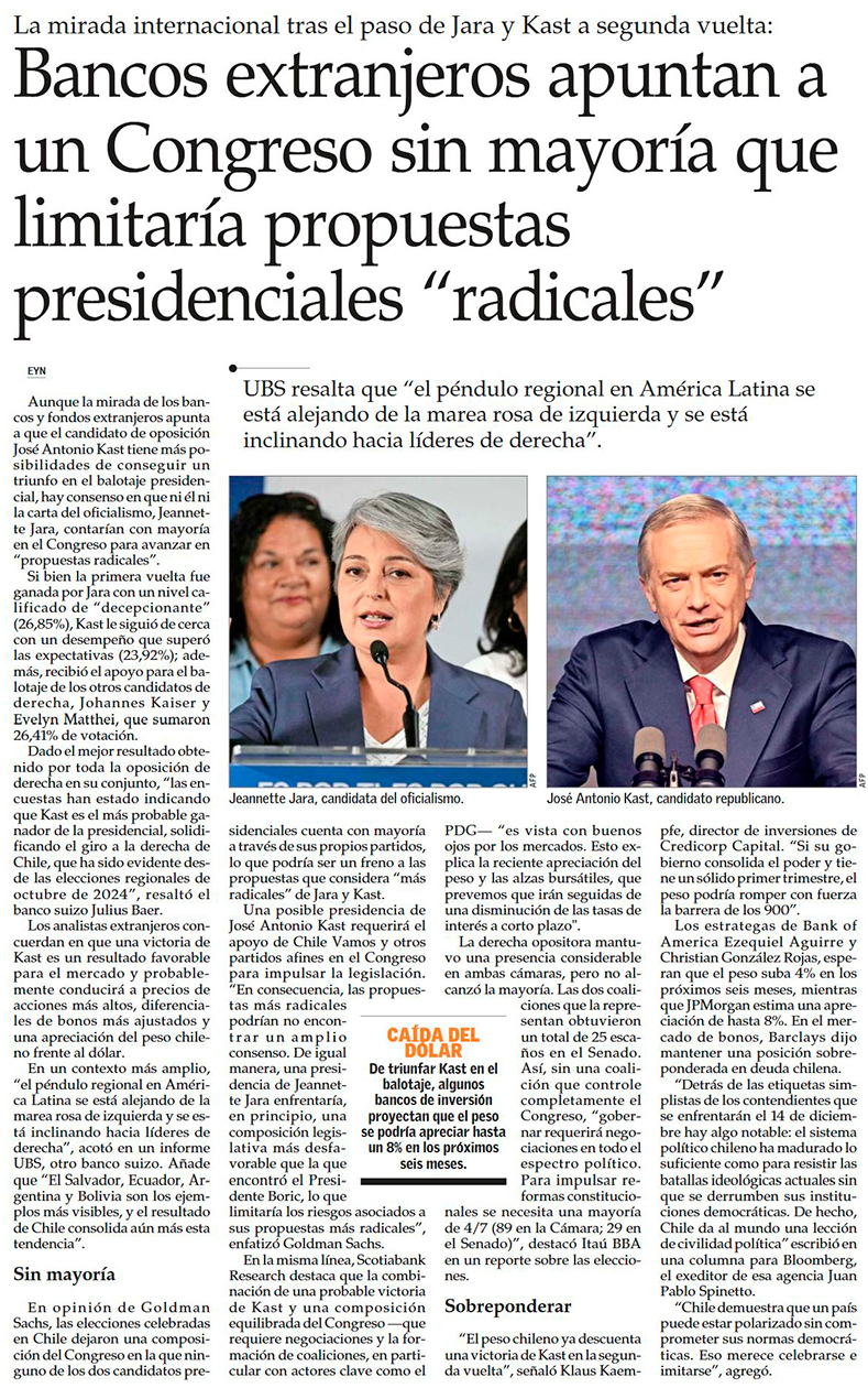 Bancos de inversión extranjeros destacan resultado electoral y anticipan impulso para activos chilenos - (Diario Financiero)
