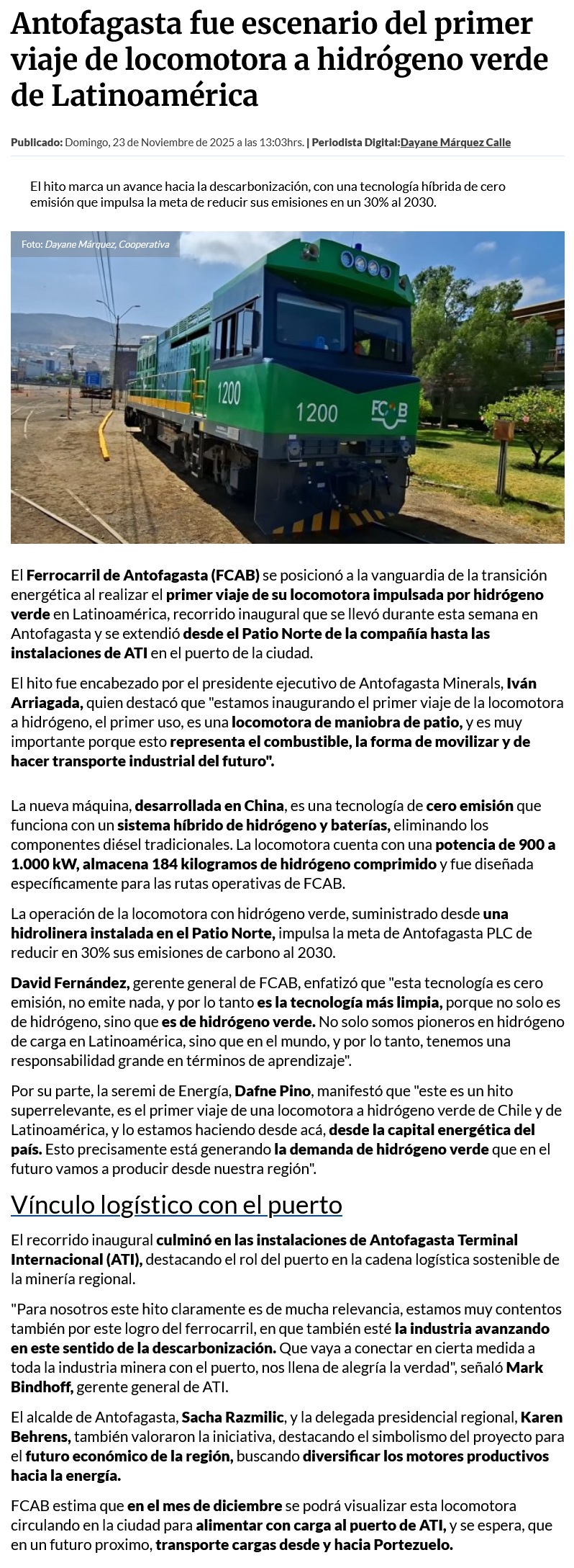 FCAB inaugura era del hidrógeno verde en transporte ferroviario - (norteonline.cl)