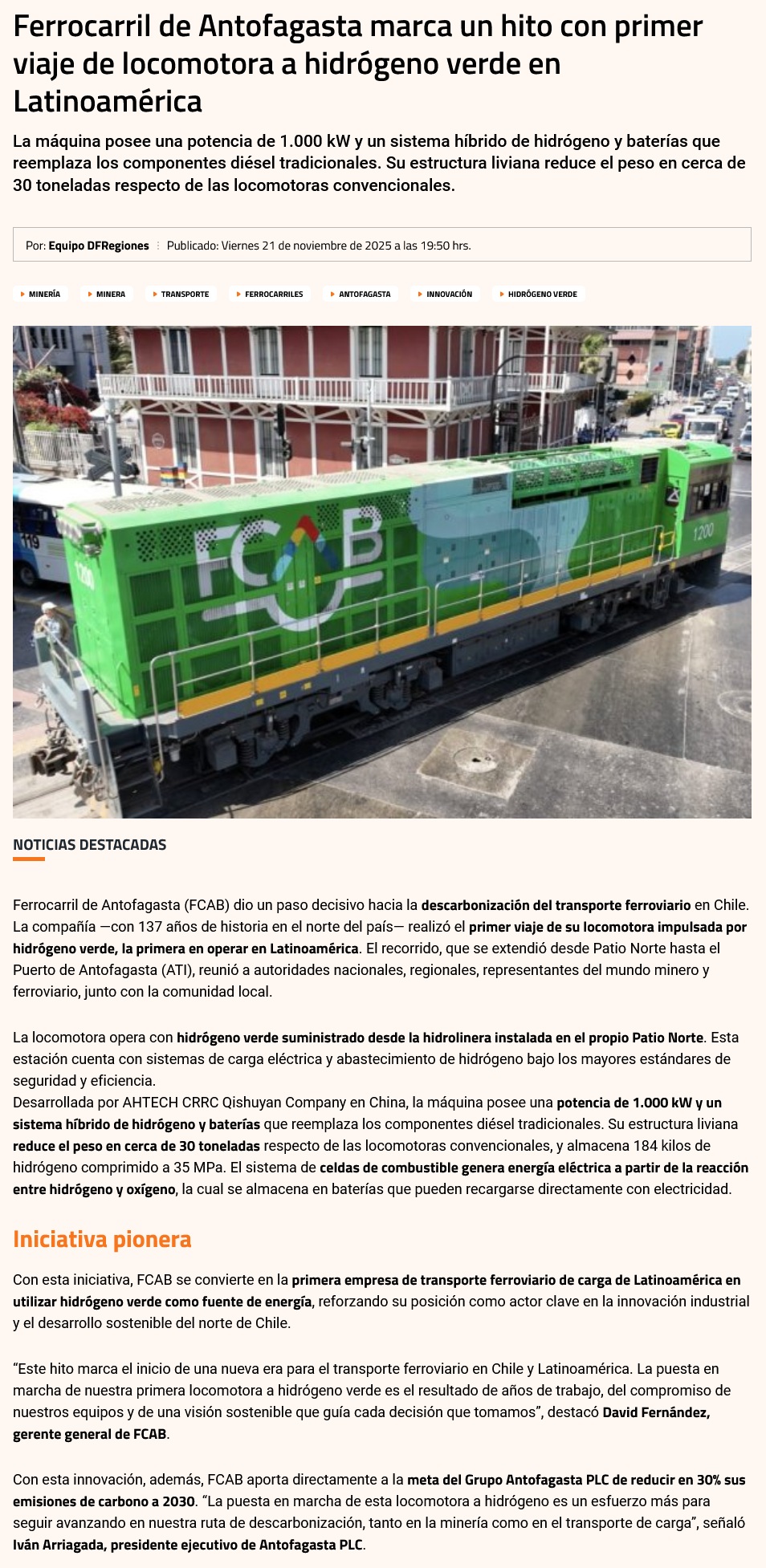 FCAB inaugura era del hidrógeno verde en transporte ferroviario - (norteonline.cl)