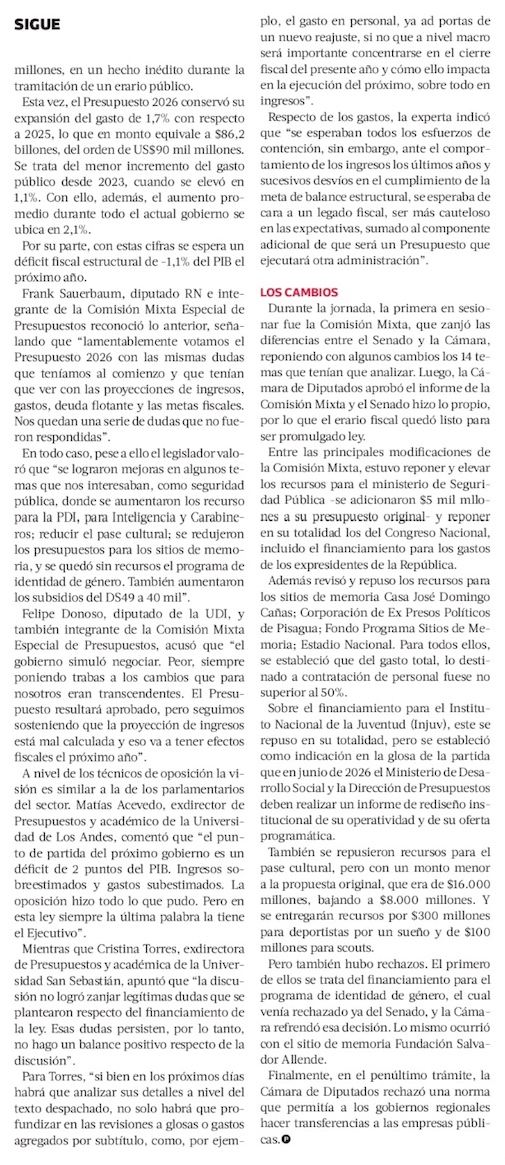 Congreso despacha el Presupuesto 2026 sin glosa republicana, pero con aumentos en Contraloría y Seguridad - (Diario Financiero)