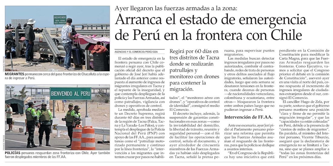 Perú anuncia declaración de estado de emergencia en frontera con Chile - (El Mercurio de Santiago)
