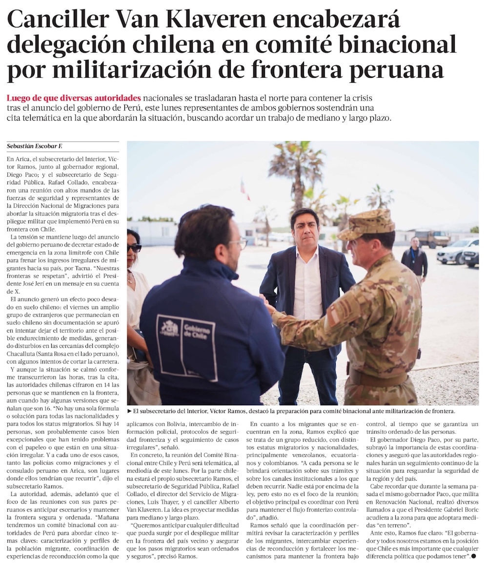 Perú anuncia declaración de estado de emergencia en frontera con Chile - (El Mercurio de Santiago)