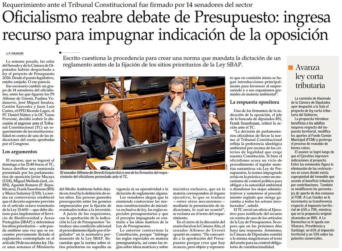 Presupuesto 2026: oficialismo manda al TC norma clave promovida por el Gobierno y la oposición - (Diario Financiero)