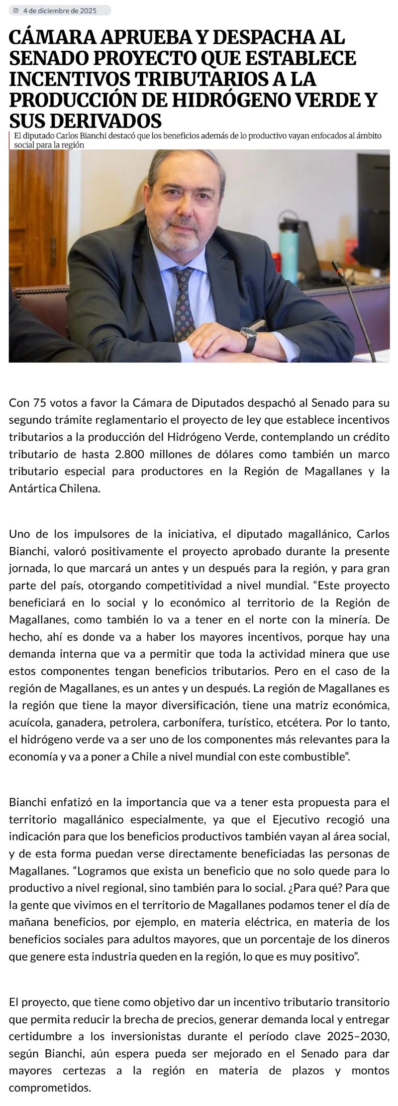 Diputados aprueban proyecto que obliga a empresas de H2V aportar el 1% a la región durante obras de construcción - (La Prensa Austral)