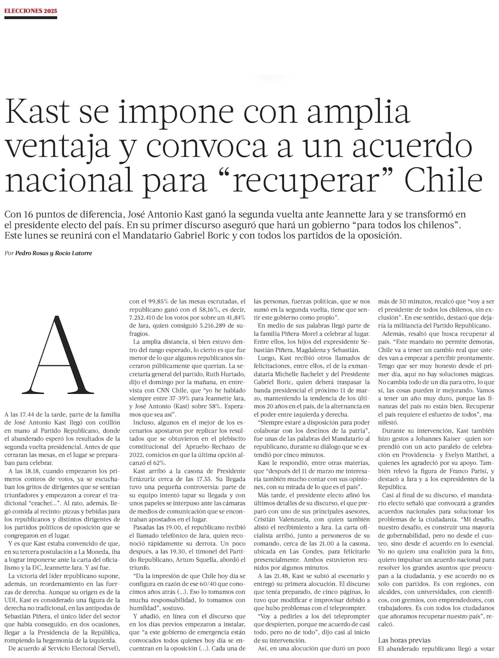 Kast logra amplia victoria con el mejor resultado presidencial para la derecha desde 1989 - (El Mercurio de Santiago)