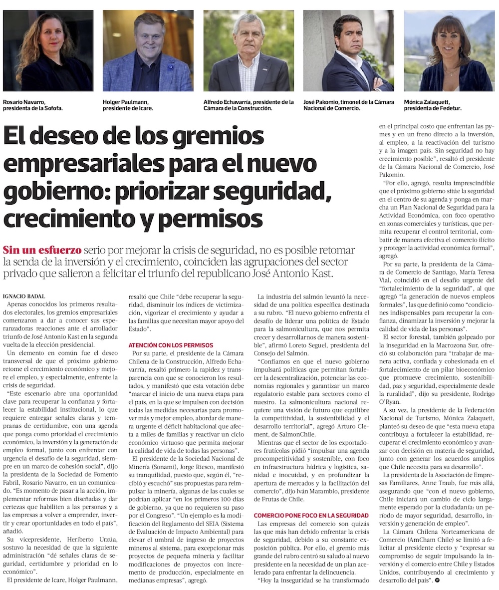 Seguridad y crecimiento económico: las prioridades empresariales para el próximo Gobierno - (Diario Financiero)
