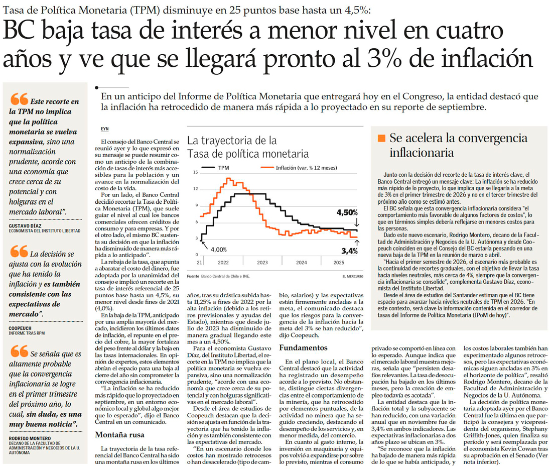 Banco Central concreta esperada baja de tasa y adelanta al próximo trimestre vuelta de la inflación a la meta - (Diario Financiero)