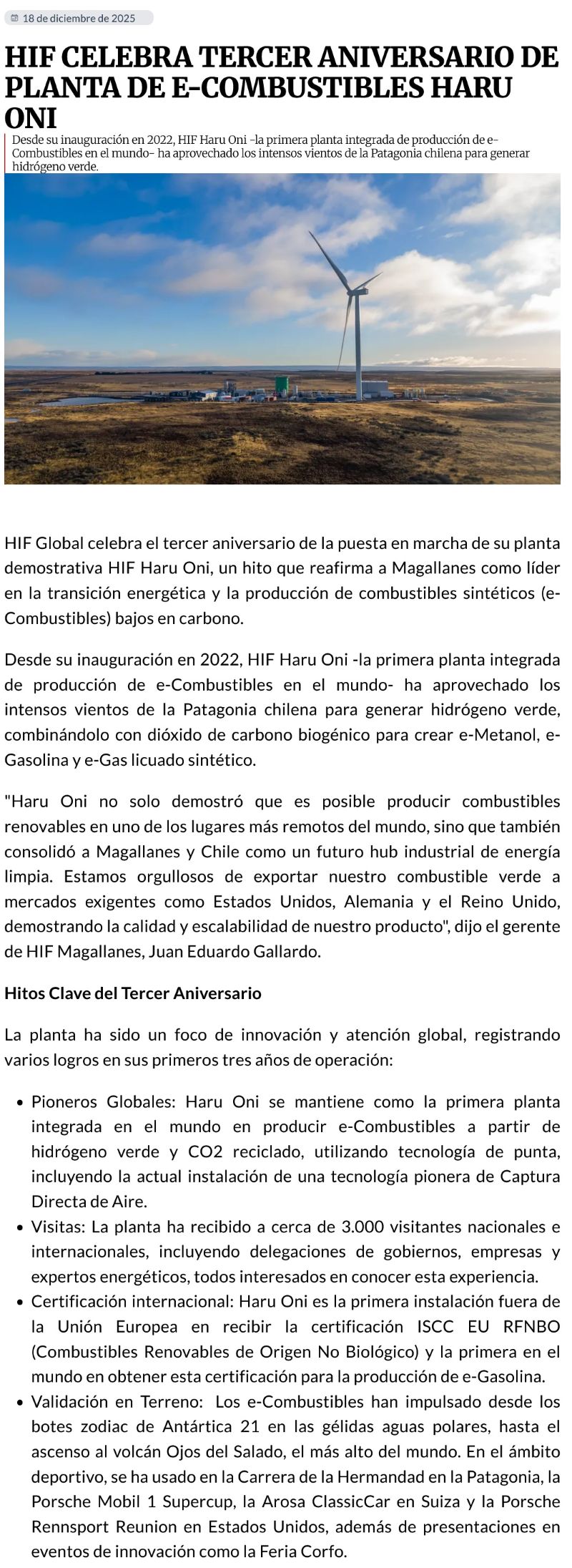 HIF celebra tercer aniversario de planta de e-Combustibles Haru Oni - (ovejeronoticias.cl)