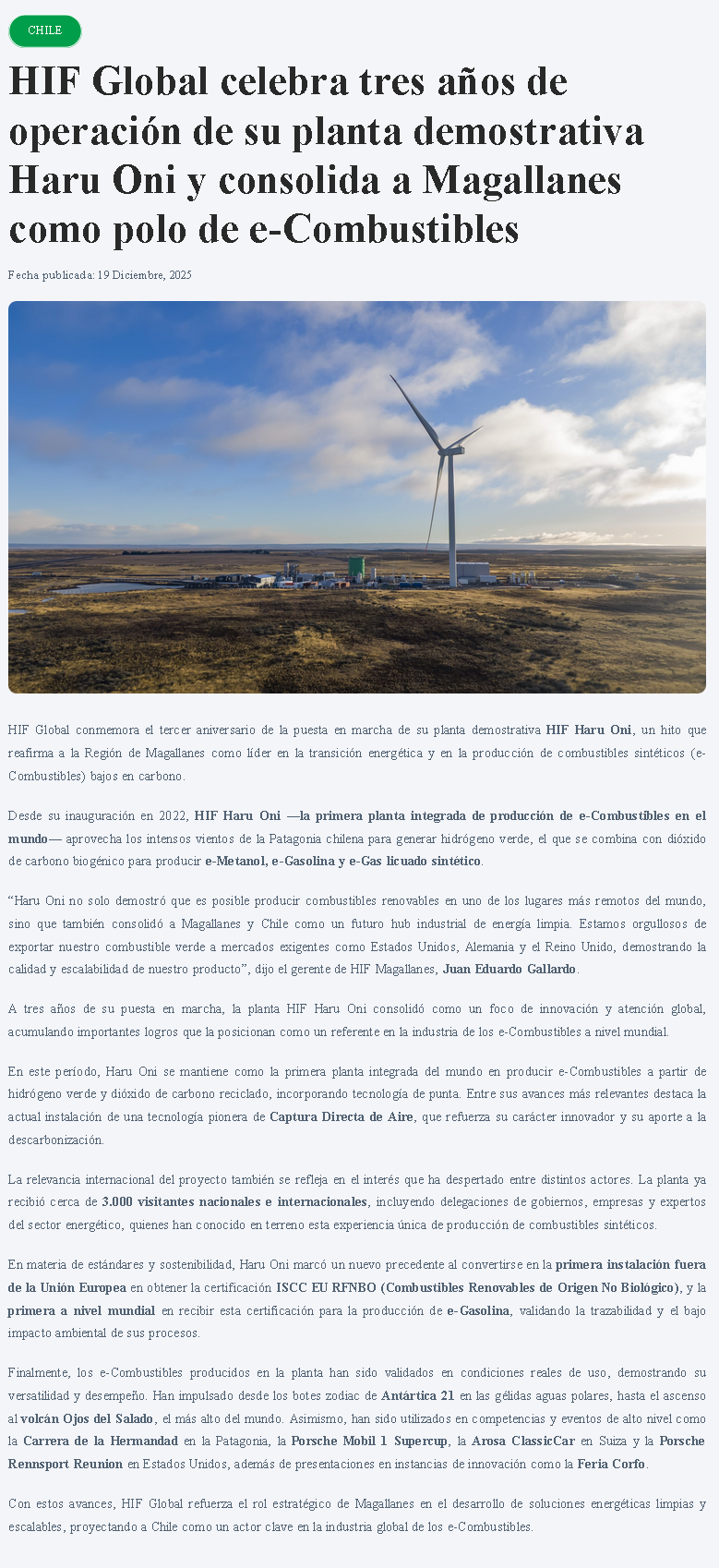 HIF celebra tercer aniversario de planta de e-Combustibles Haru Oni - (ovejeronoticias.cl)
