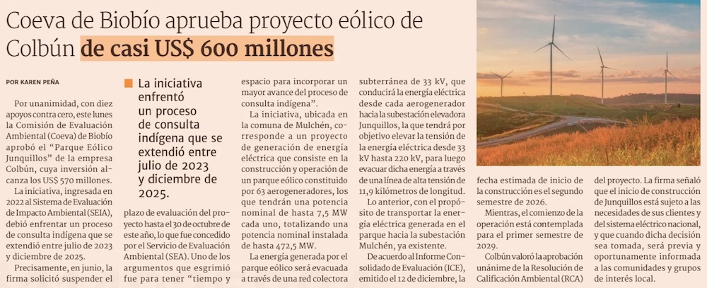 Colbún logra permiso ambiental de su proyecto eólico Junquillos en Biobío y espera iniciar su construcción en 2026 - (Pulso)