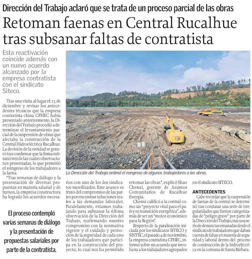 Dirección del Trabajo autoriza la reanudación parcial de las obras de la Central Hidroeléctrica Rucalhue - (Diario Financiero)