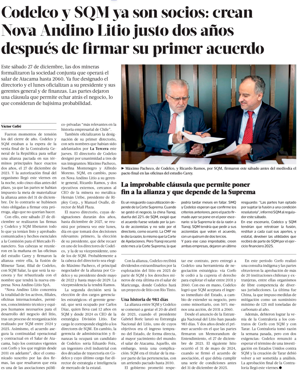 Codelco y SQM formalizan sociedad conjunta NovaAndino litio para el desarrollo en el Salar de Atacama hasta 2060 - (Diario Financiero)