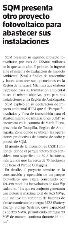 SQM ingresa proyecto fotovoltaico y línea de transmisión destinados a su operación - (El Mercurio de Antofagasta)