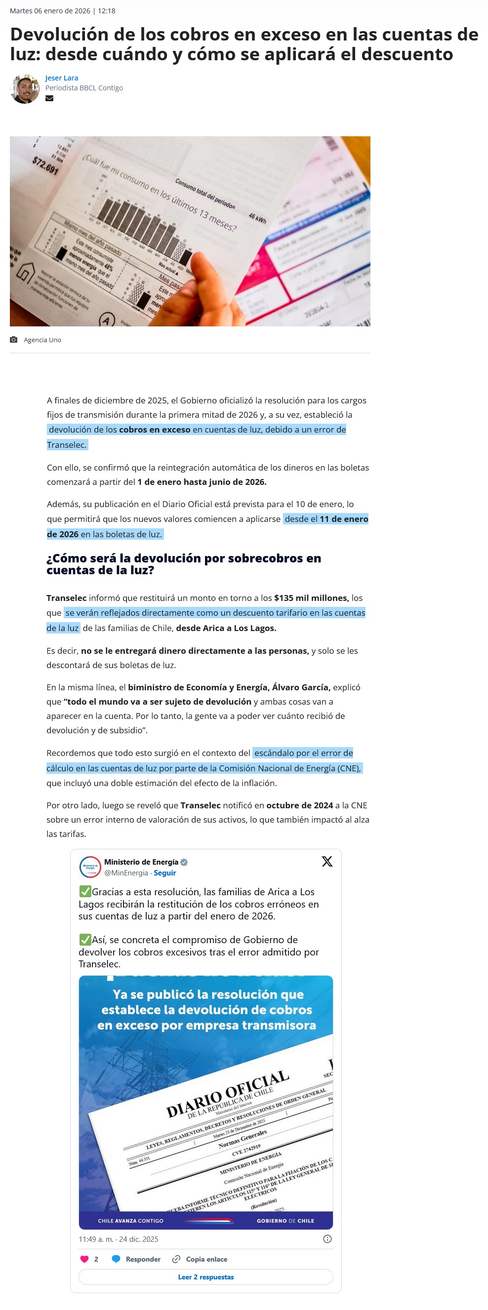 Gobierno inicia devolución automática de cobros en exceso en cuentas de la luz desde enero de 2026 - (radioua.cl)