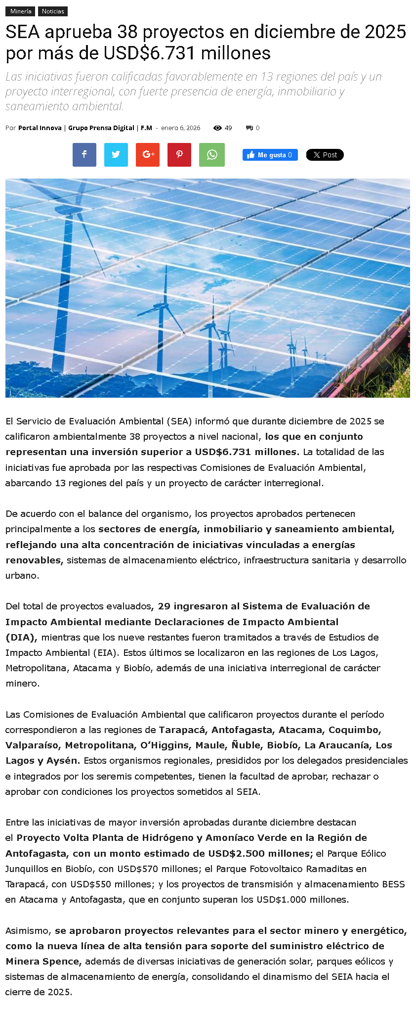 Aprobación ambiental de proyectos alcanza récord histórico de US$ 41.530 millones en 2025 - (puranoticia.cl)
