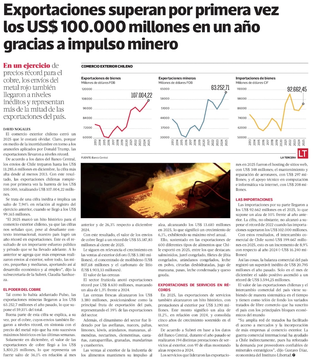 Exportaciones cierran 2025 con nuevo récord: superan los US$ 100 mil millones gracias al cobre - (Diario Financiero)