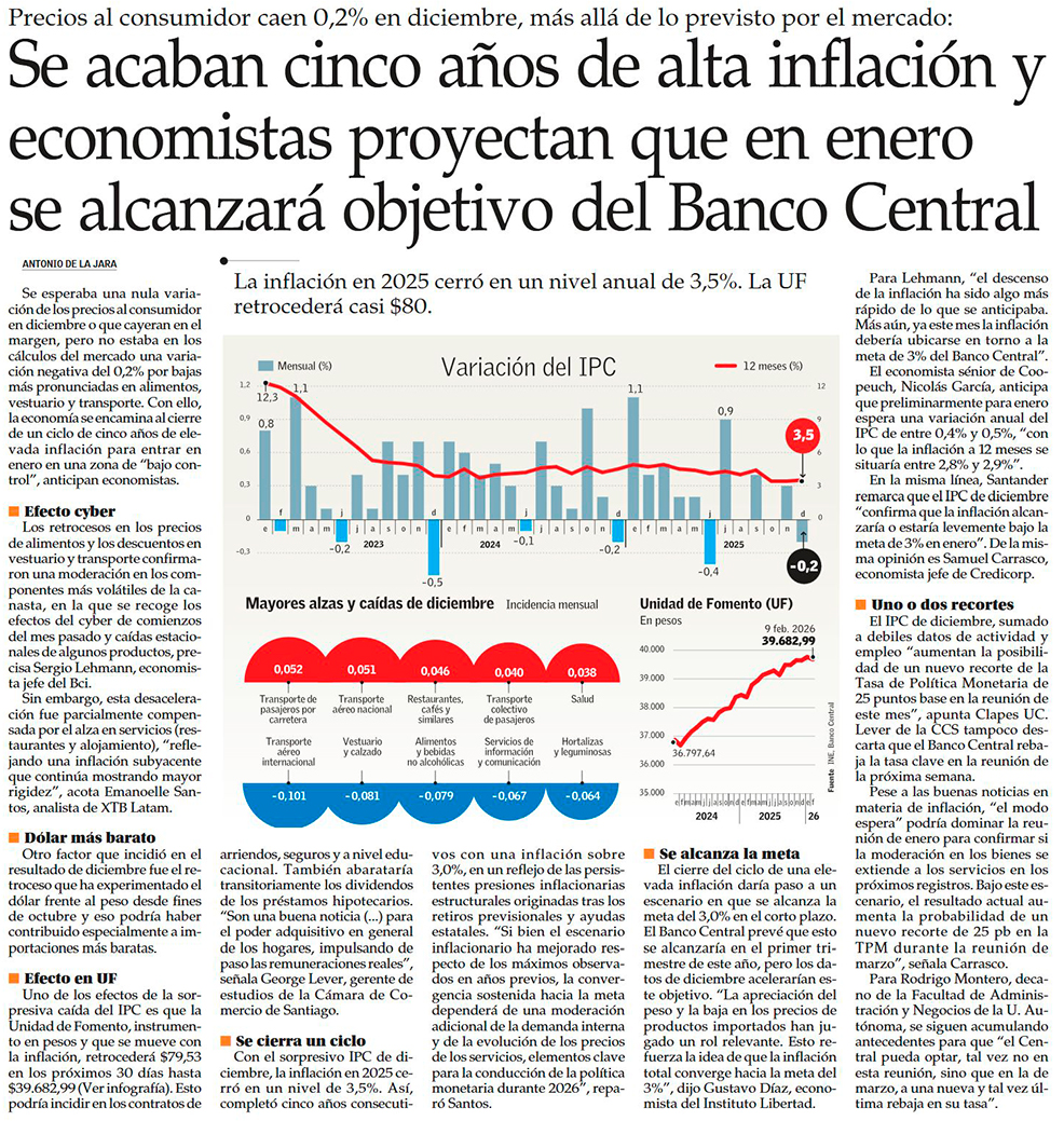 La inflación cierra el 2025 en el menor nivel en cinco años y sube opción de llegar a la meta del 3% en enero - (Diario Financiero)
