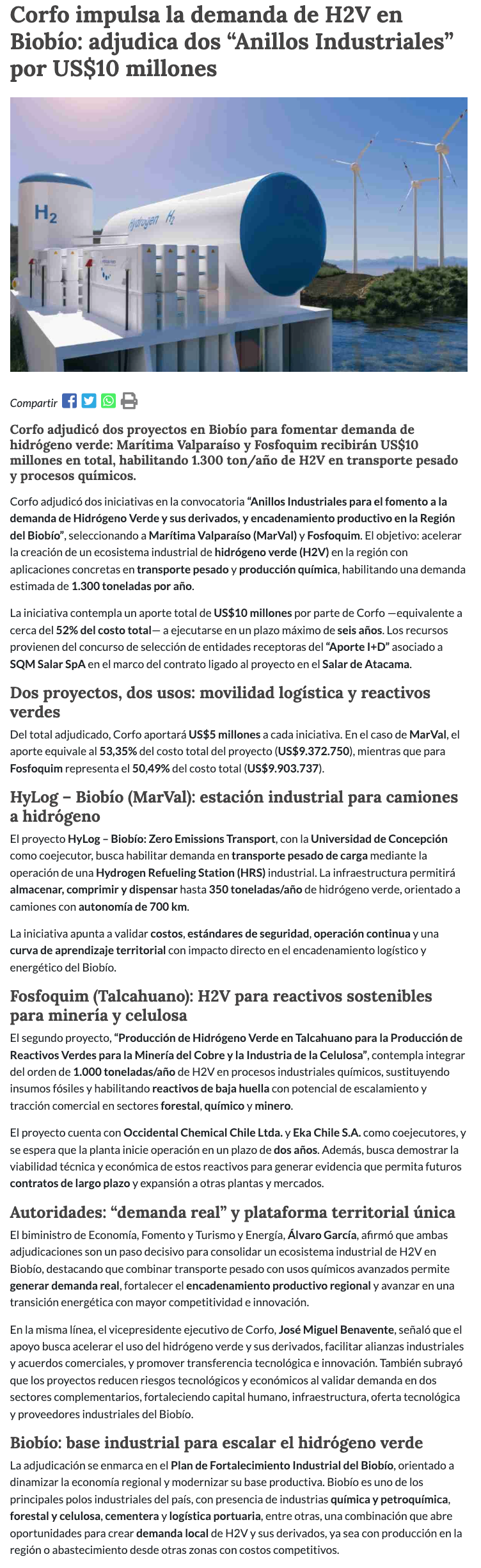 Corfo impulsa la demanda de H2V en Biobío: adjudica dos “Anillos Industriales” por US$10 millones - (cualestuhuella.cl)