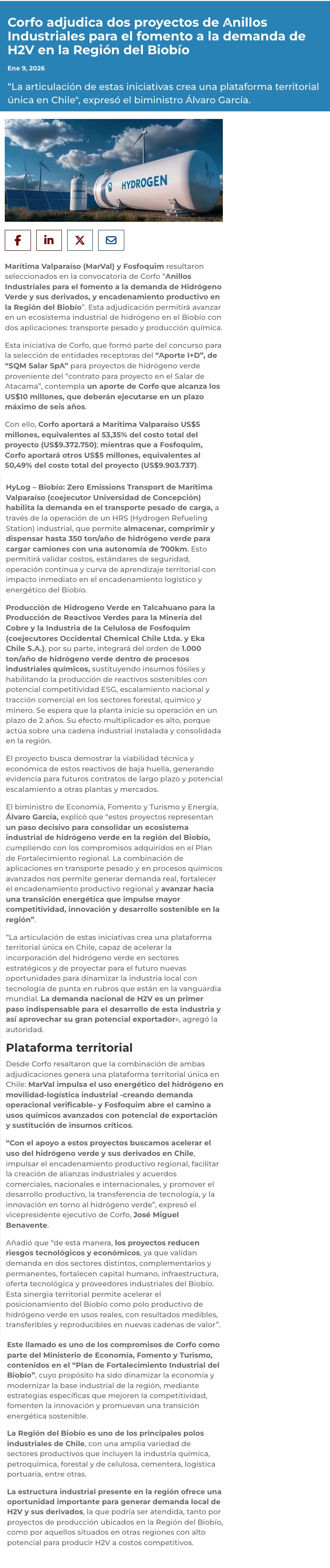 Corfo adjudica dos proyectos de Anillos Industriales para el fomento a la demanda de H2V en la Región del Biobío - (electromineria.cl)