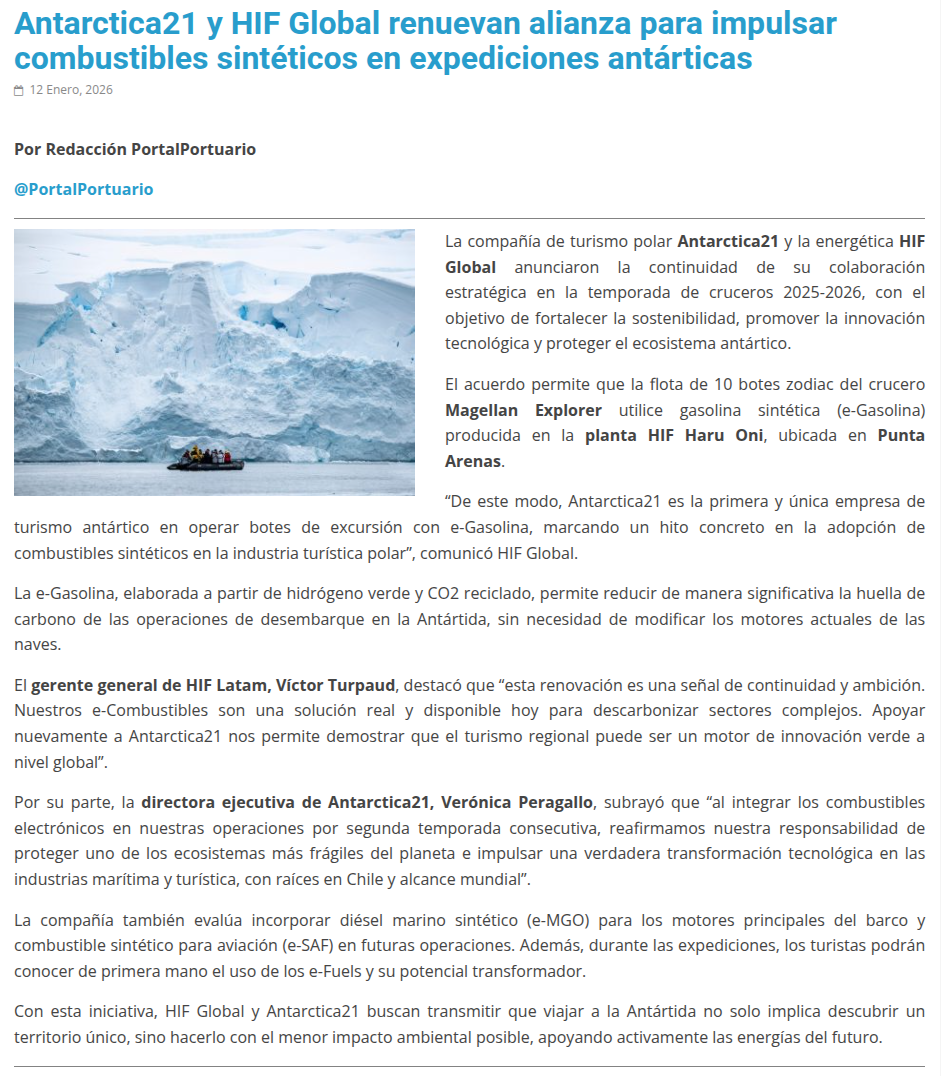 Antarctica21 y HIF Global renuevan su alianza exclusiva: e-combustibles impulsan expediciones sostenibles a la Antártica - (radiopolar.com)