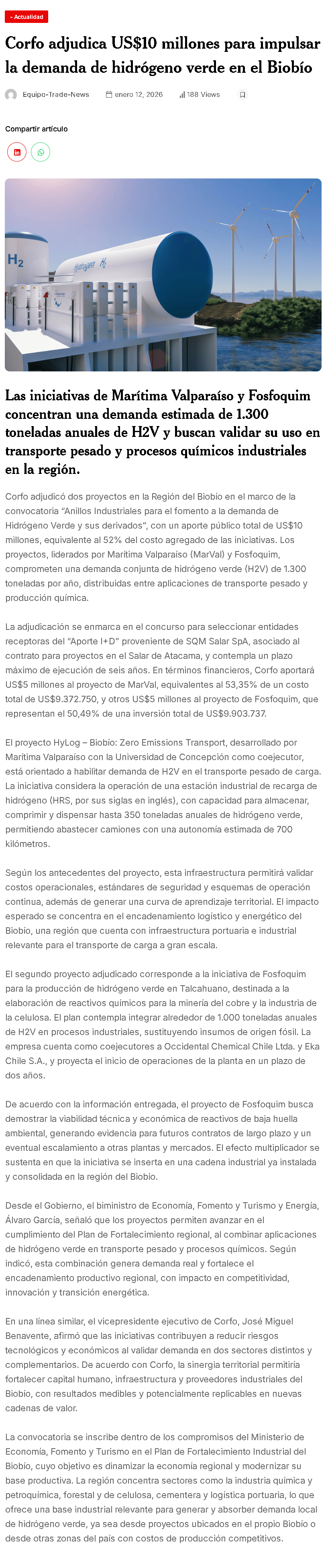 Corfo inyecta US$ 10 millones para activar mercado del hidrógeno verde desde Biobío - (DF Online)