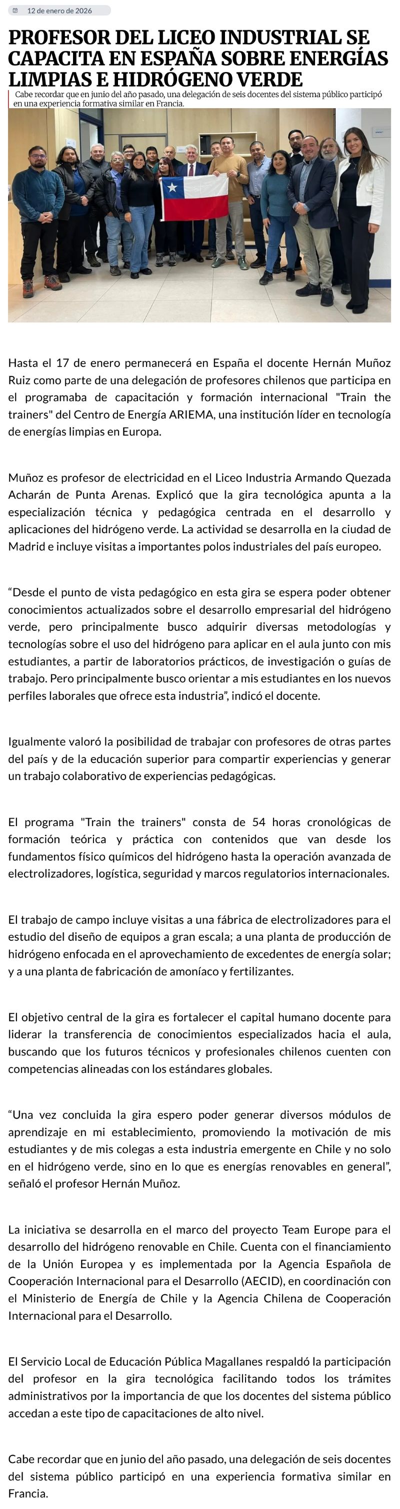 Profesor del Liceo Industrial se capacita en España sobre energías limpias e hidrógeno - (El Pingüino)