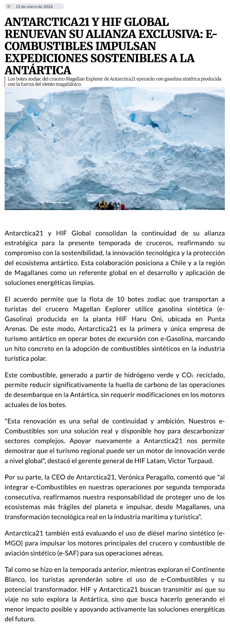 Antarctica21 y HIF Global renuevan su alianza exclusiva: e-Combustibles impulsan expediciones sostenibles a la Antártica - (ovejeronoticias.cl)