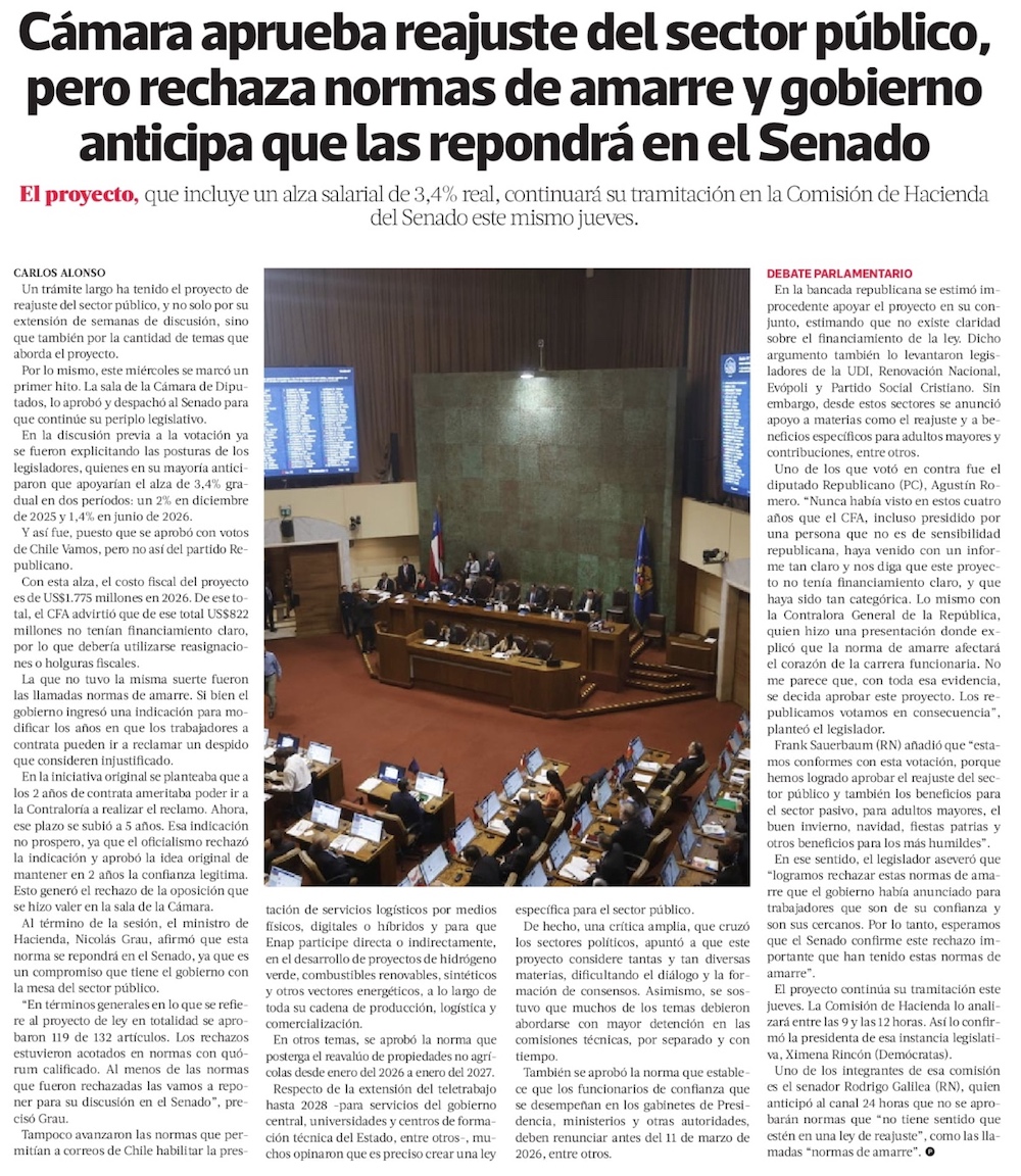 Gobierno sufre rechazo de normas de amarre en la Cámara y buscará reponerlas en debate en el Senado - (El Mercurio de Santiago)