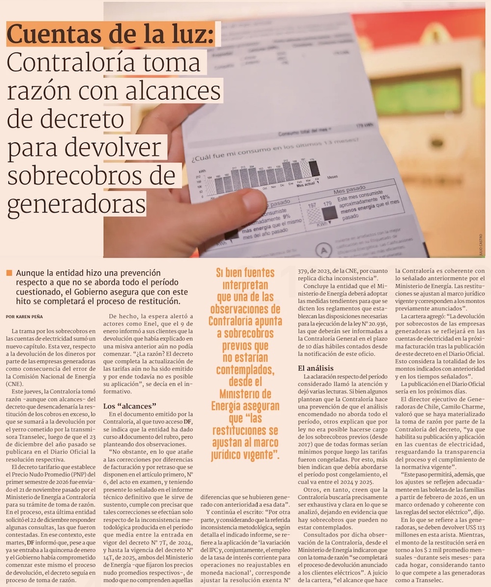 Contraloría da luz verde a devolución en cuentas de la luz - (El Mercurio de Santiago)