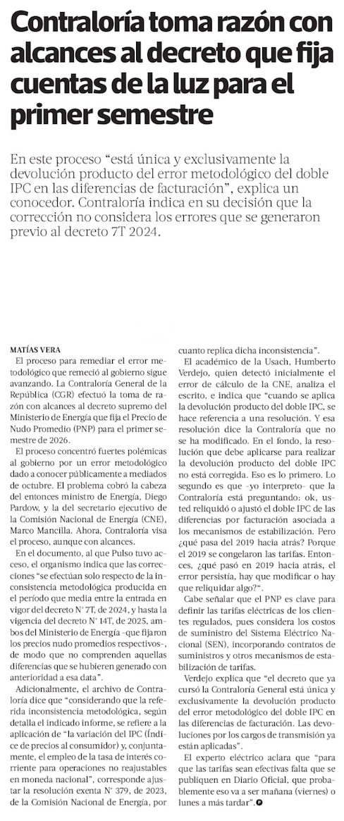 Cuentas de la luz: Contraloría toma razón con alcances de decreto para devolver sobrecobros de generadoras - (Diario Financiero)
