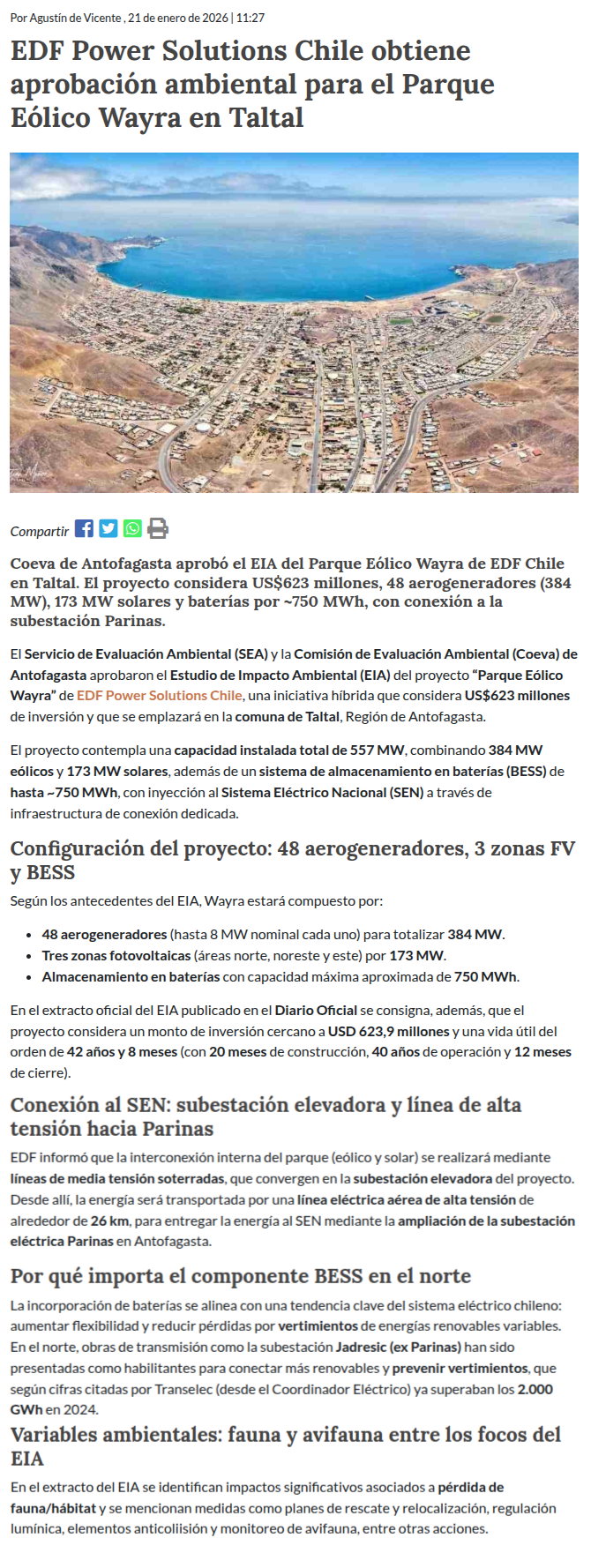 Aprueban proyecto eólico y solar de 557 MW de potencia y 750 MWh de almacenamiento - (El Mercurio de Antofagasta)