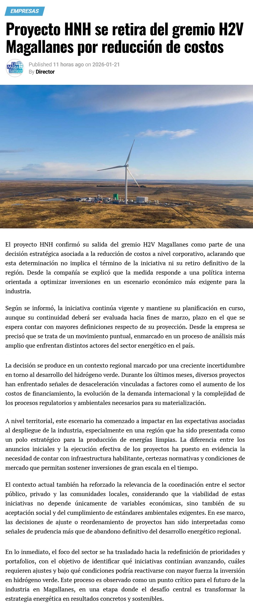 Comunicado: HNH Energy informa el cese de su participación en la asociación gremial H2V Magallanes - (h2news.cl)
