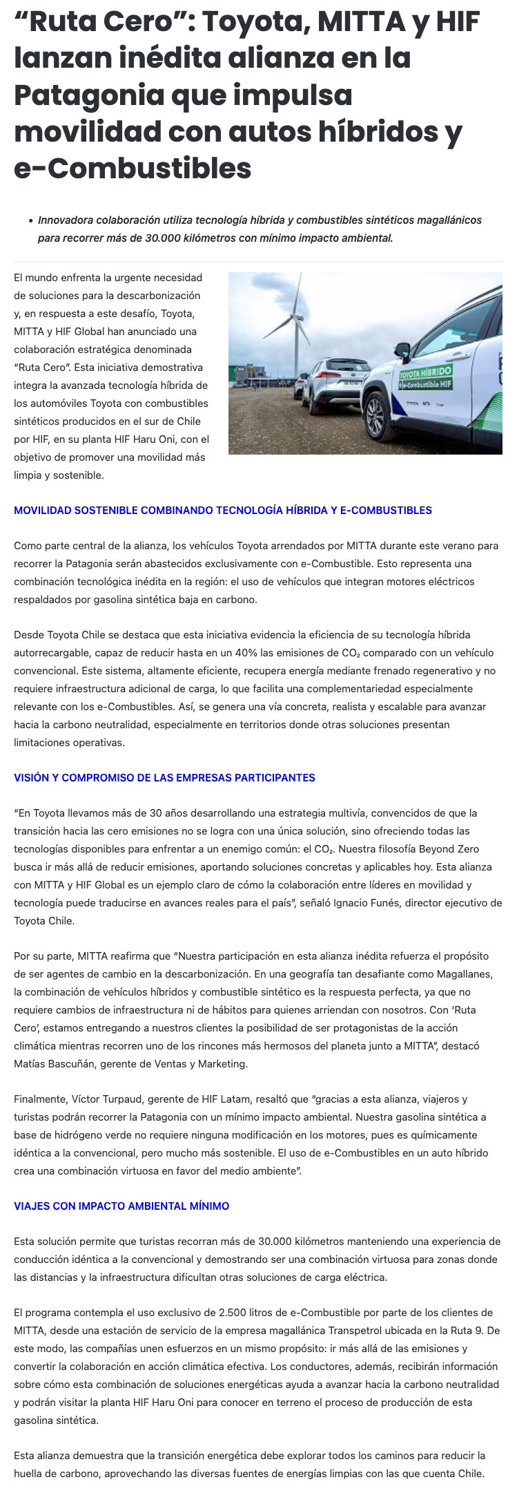 “Ruta Cero”: Toyota, MITTA y HIF lanzan inédita alianza en la Patagonia para impulsar movilidad con autos híbridos y e-Combustibles - (h2news.cl)