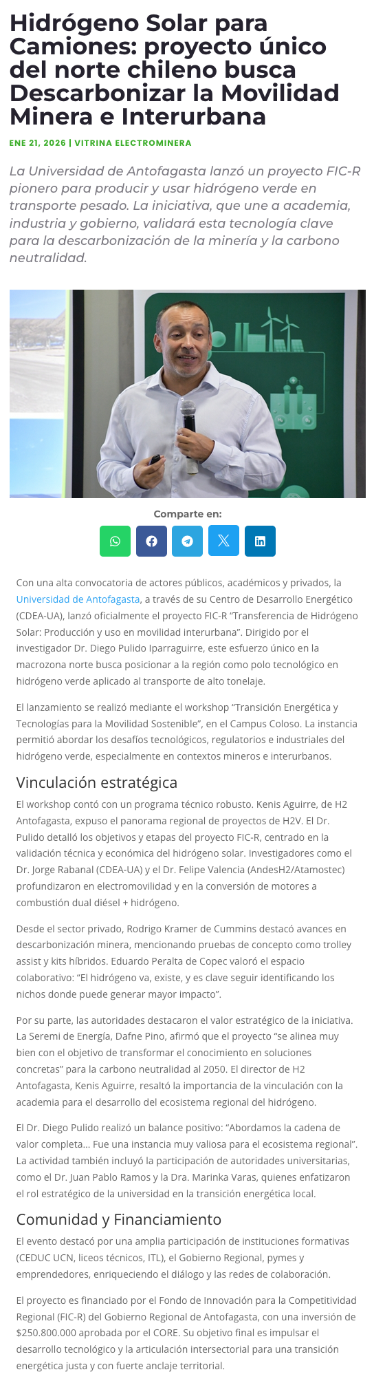 CDEA-UA lanza proyecto FIC-R de hidrógeno solar para movilidad interurbana en Antofagasta - (reporteminero)