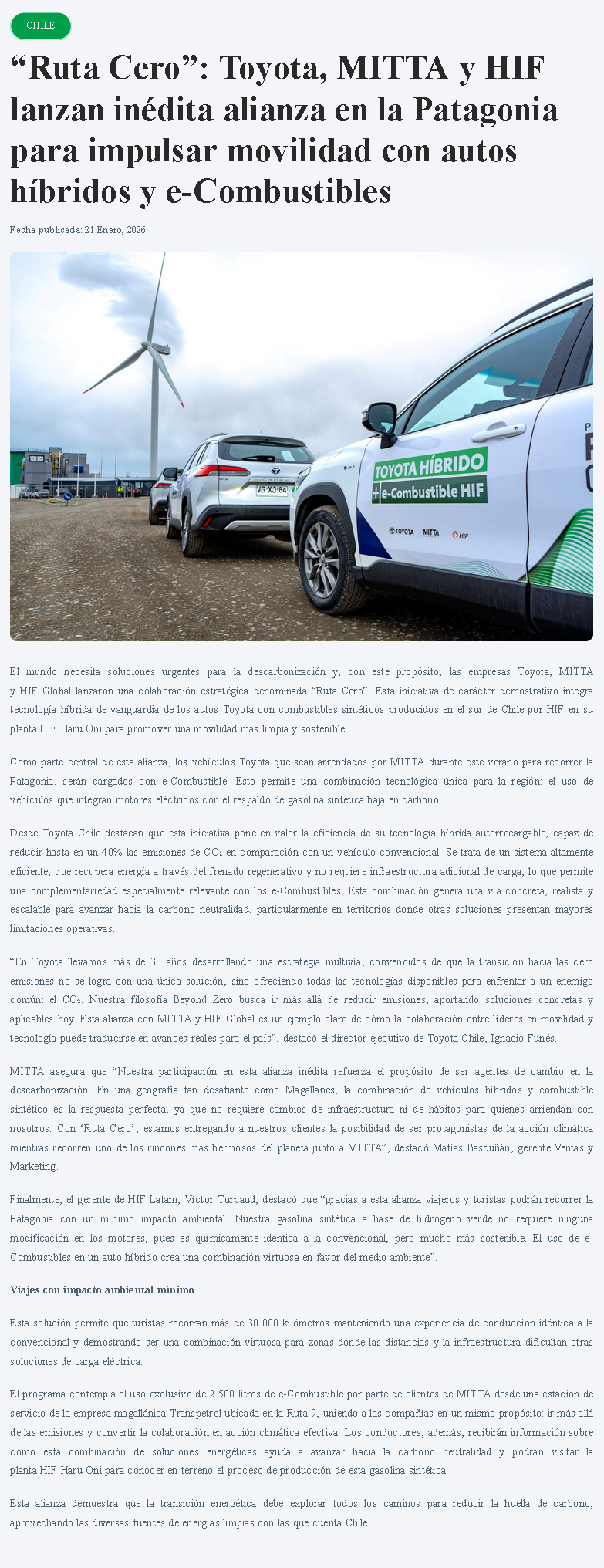 “Ruta Cero”: Toyota, Mitta y HIF Global lanzan inédita alianza en la Patagonia para impulsar movilidad con autos híbridos y e-combustibles - (guiachileenergia.cl)