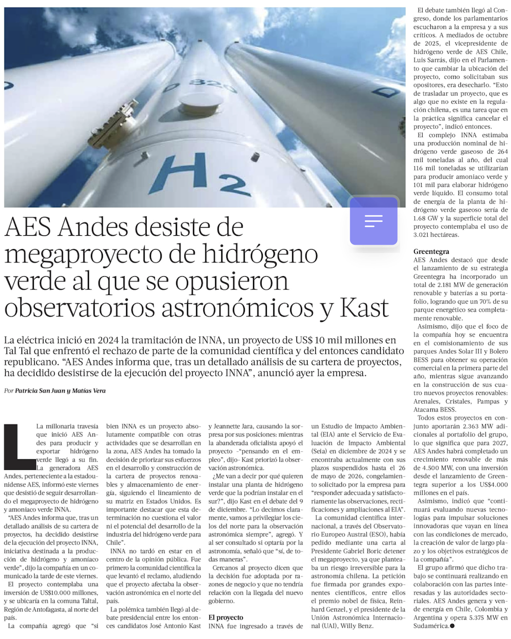 AES Andes da pie atrás a polémico proyecto de hidrógeno verde criticado por el mundo científico y Kast - (puranoticia.cl)