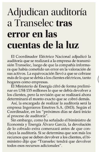 Coordinador Eléctrico define la empresa que realizará auditoría a las instalaciones de Transelec por error que implicó sobrecobros en las cuentas de la luz - (DF Online)