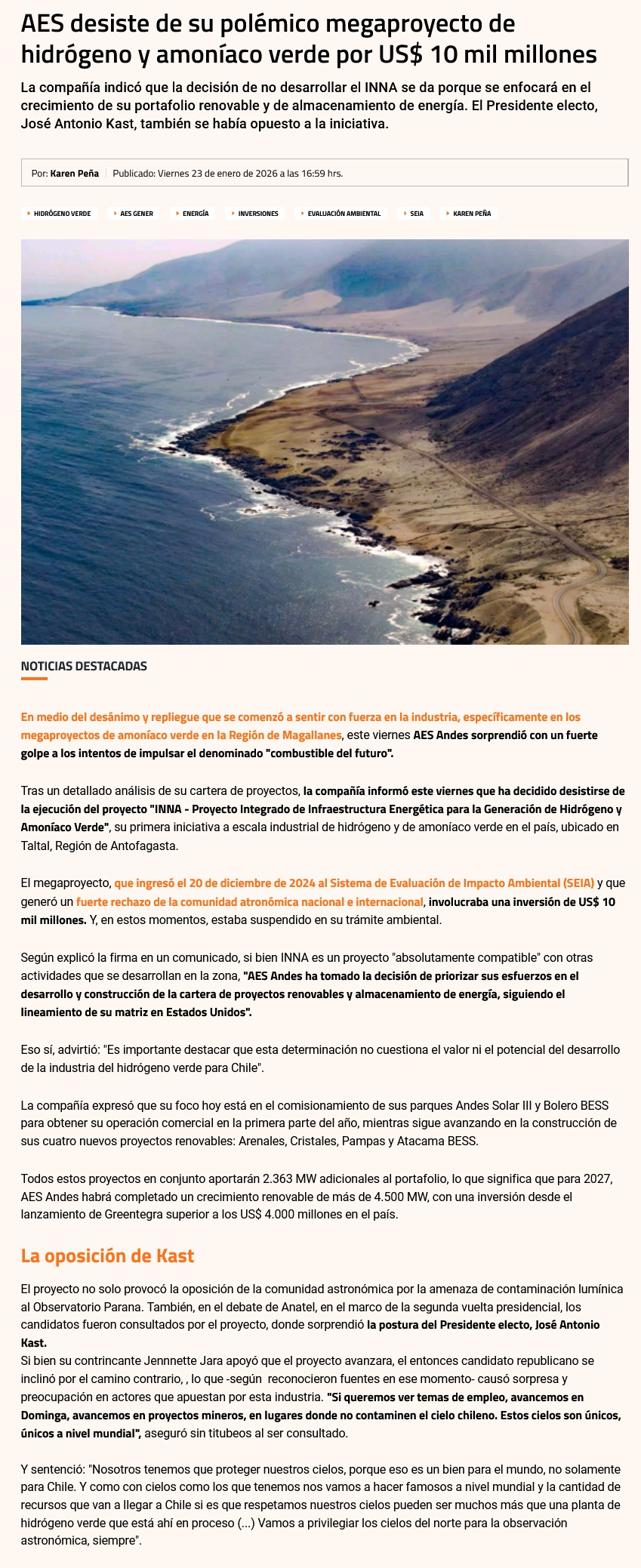 AES Andes desiste de proyecto de hidrógeno verde INNA por US$ 10 mil millones (y el rechazo de Kast a la iniciativa) - (ex-ante.cl)