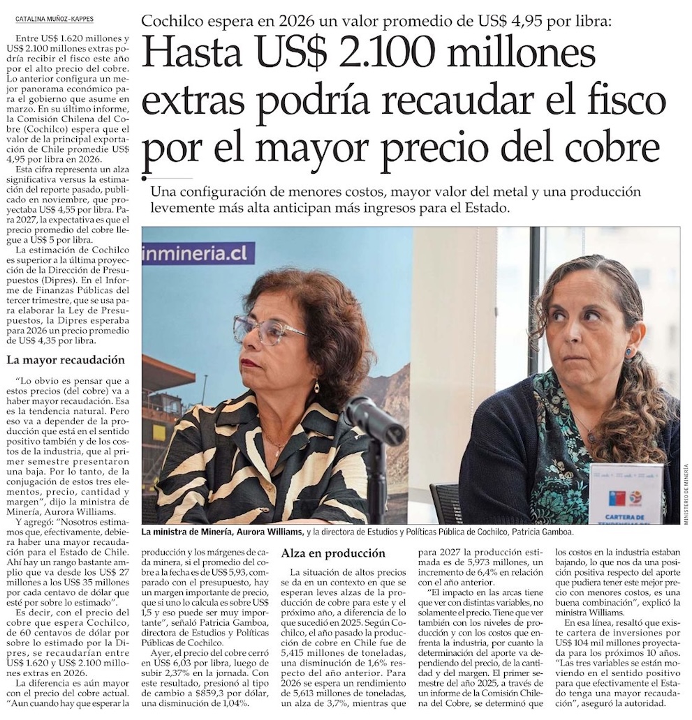 Cochilco eleva proyección del precio del cobre y estima un promedio de US$ 4,95 este año y US$ 5 en 2027 - (Diario Financiero)