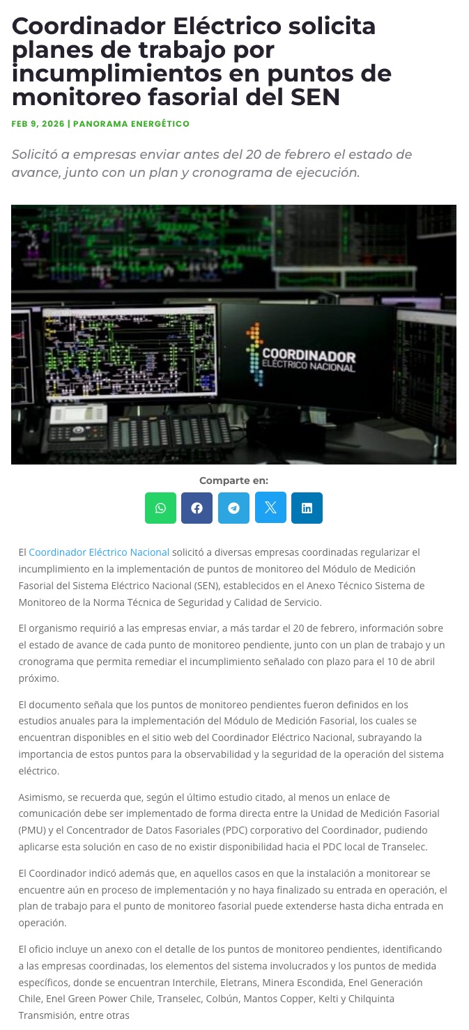 Coordinador Eléctrico exige planes de trabajo a empresas por incumplimientos en monitoreo fasorial del Sistema Eléctrico Nacional - (duplos.cl)
