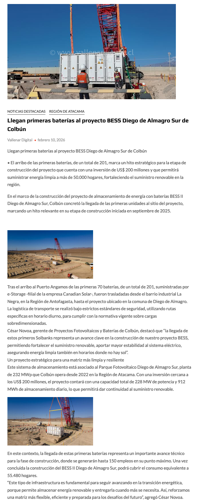Llegan primeras baterías al proyecto BESS Diego de Almagro Sur de Colbún - (soyantofagasta)
