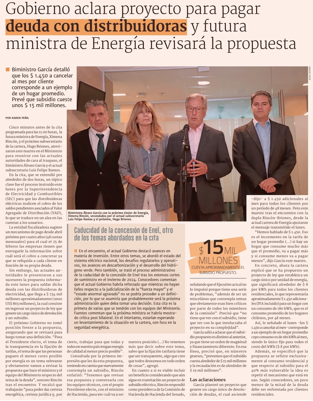 Alza en cuentas de la luz: Rincón deja en suspenso respaldo a propuesta del gobierno para pagar deuda a distribuidoras - (Pulso)
